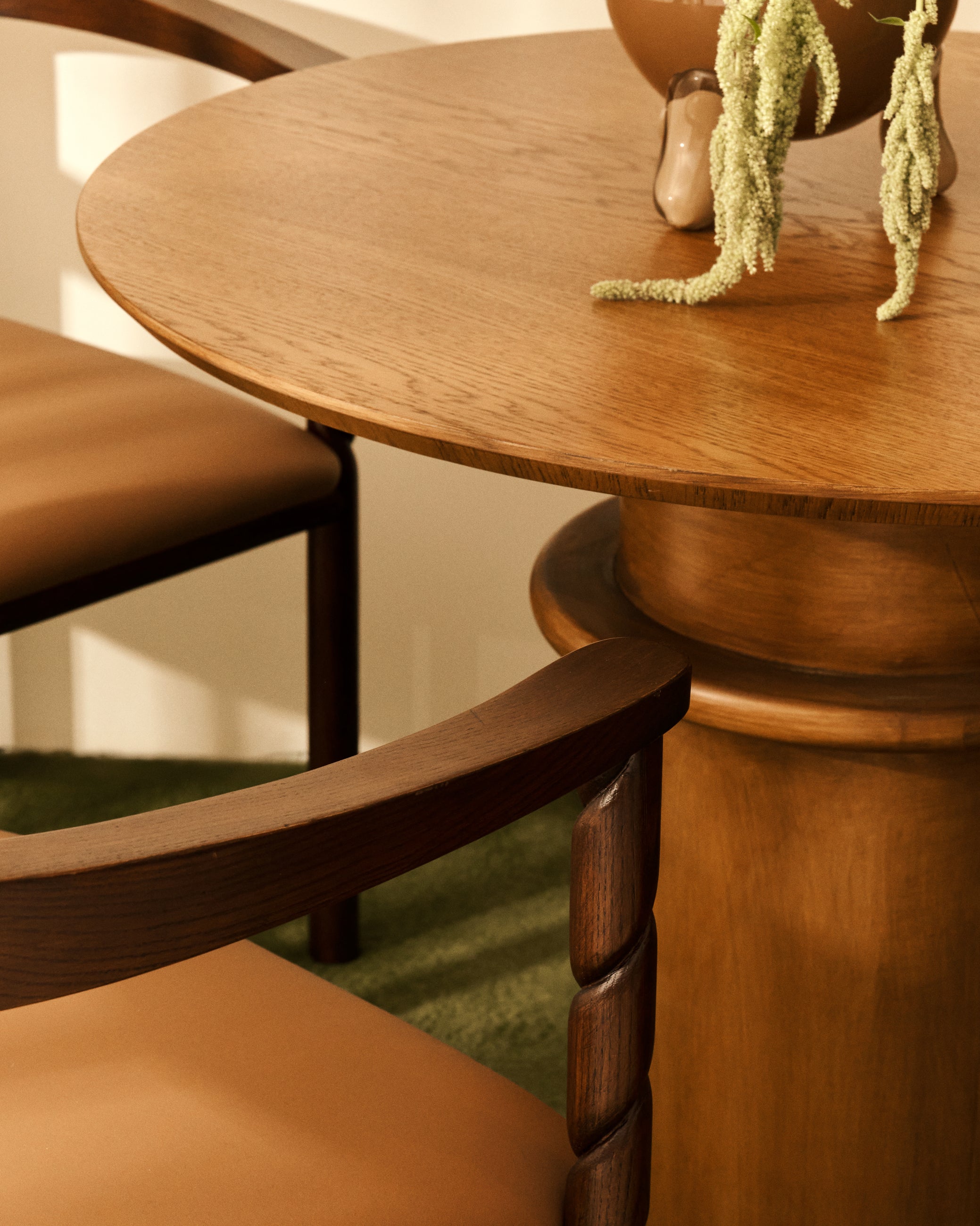 Our oak dining table is a small-scale statement for kitchens and cosy corners, with a smooth round top balanced on a bold, sculptural pedestal base. Crafted entirely from solid oak, it shows off a warm, natural grain that pairs beautifully with both classic and more playful chairs. The proportions feel intimate yet generous enough for shared plates, late breakfasts and long, easy dinners - a simple, grounded piece that quietly becomes the heart of the room.
