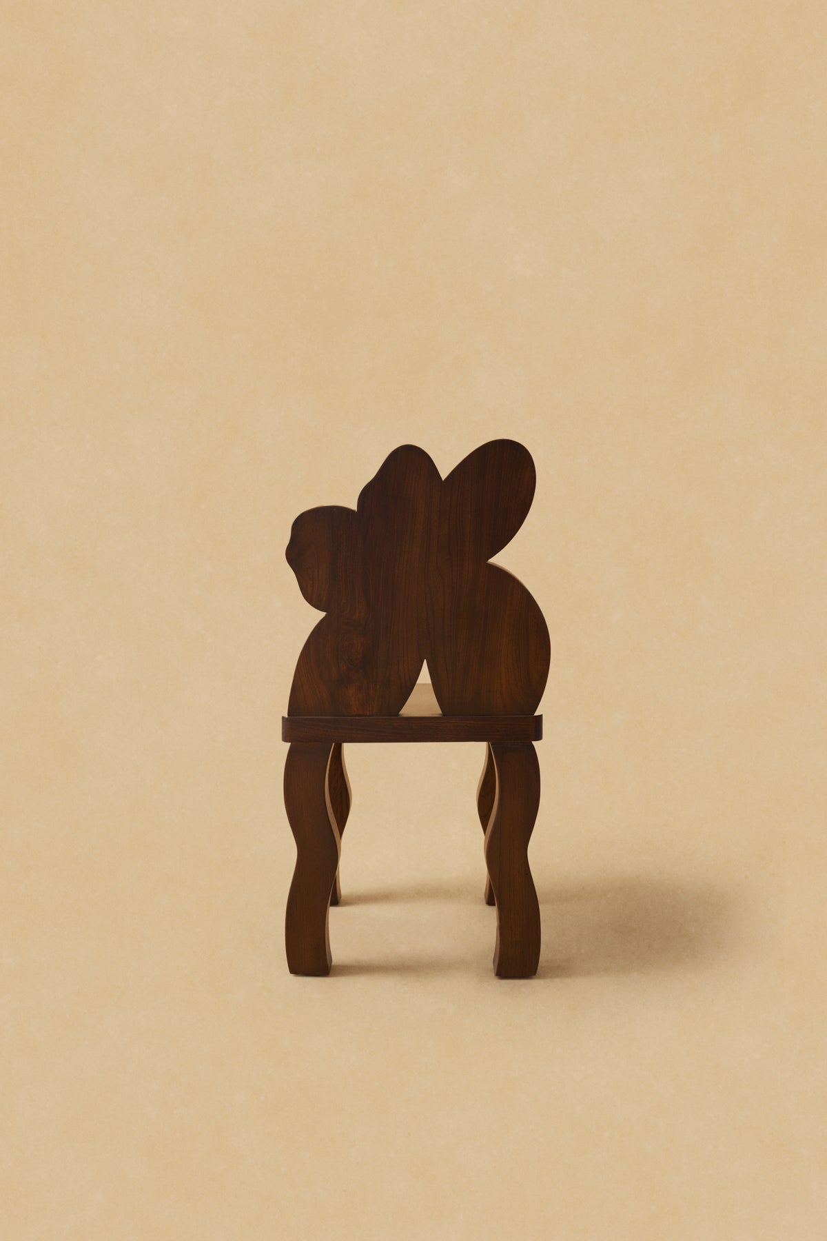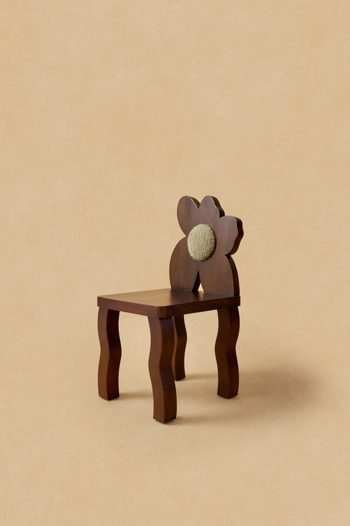 The Poppy Chair features a dark green hue inspired by the earth, complementing The Honey Chair. Crafted from oak wood, it showcases a sculptural flower-shaped back with a teddy fabric center, adding a soft, inviting contrast to its solid form. Handcrafted in Istanbul.